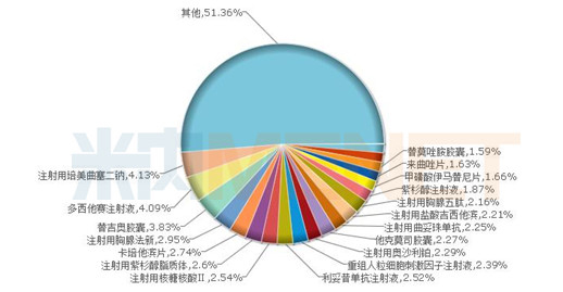 圖3:2017年中國(guó)公立醫(yī)療機(jī)構(gòu)終端抗腫瘤和免疫調(diào)節(jié)劑格局