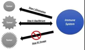 3. 逃逸——此階段的腫瘤細(xì)胞能夠完全戰(zhàn)勝宿主免疫系統(tǒng)機(jī)制,逃避以后的免疫監(jiān)視。