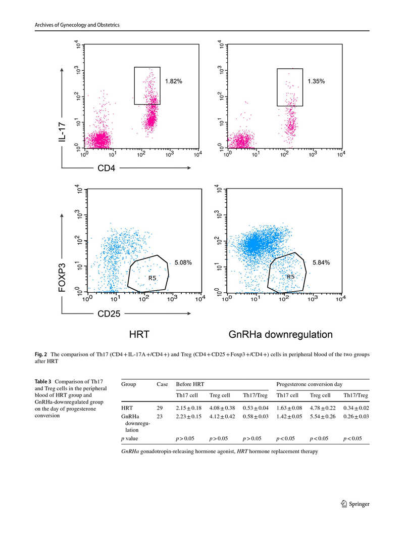 結(jié)果:HRT前,HRT組與對照組相比,CD4+淋巴細胞中的Th17和Treg細胞數(shù)量分別增加和減少,Th17 / Treg細胞比值升高(p<0.05)。在孕酮轉(zhuǎn)化當天,與HRT組相比,GnRHa降調(diào)組的Th17和Treg細胞百分比分別降低和升高,Th17 / Treg細胞比值顯著降低(p<0.05)。GnRHa降調(diào)組的雌激素(E2)水平略高于HRT組,兩組間差異無統(tǒng)計學意義(p> 0.05)。此外,HRT組和GnRHa降調(diào)組在移植后第14天和第21天的絨毛膜促性腺激素水平?jīng)]有顯著差異(p>0.05)。
